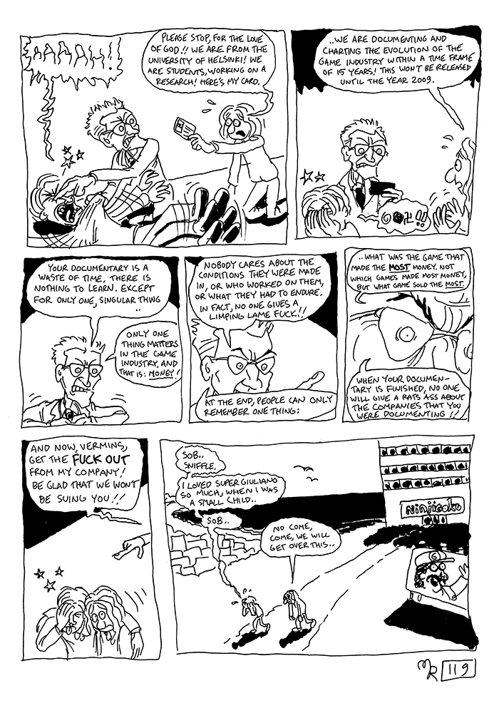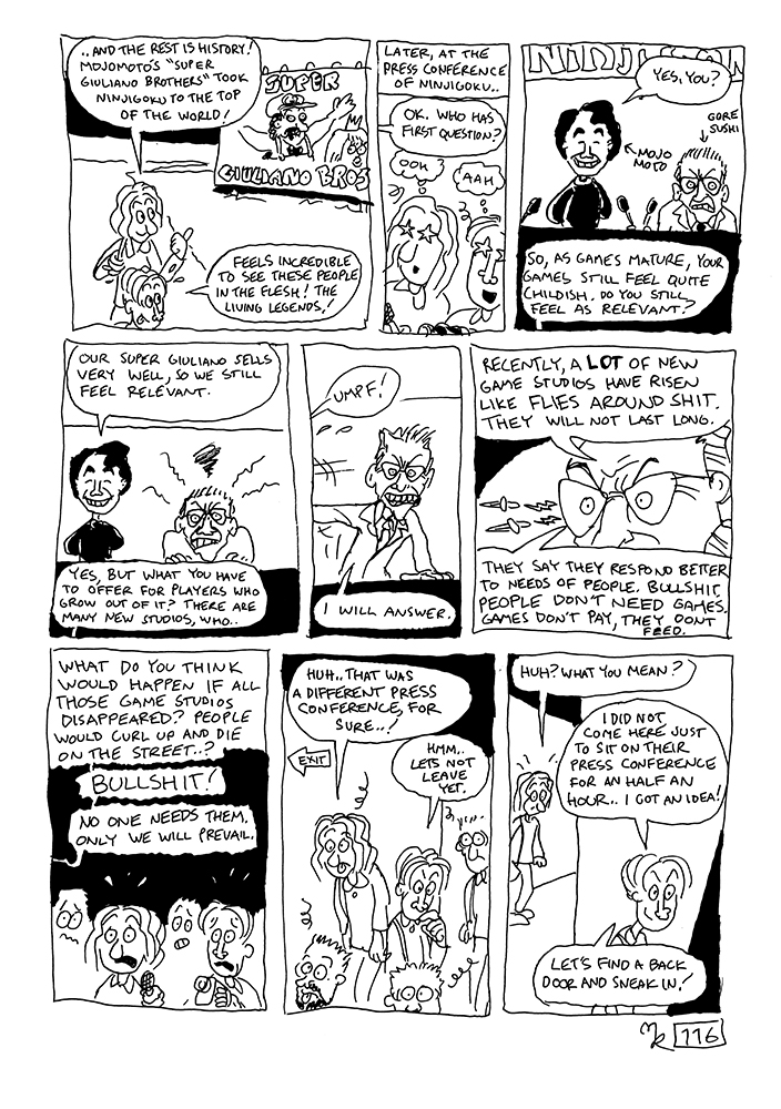 Our documentary makers take a trip to japan where the press conference of Ninjigoku, legendary studio behind Super Giuliano, is held. Sneaky detour into the offices leads them up into a confrontation with Harshy Goresushi himself, the feared Ninjigoku CEO, who teaches our friends a stern lesson about the game industry.