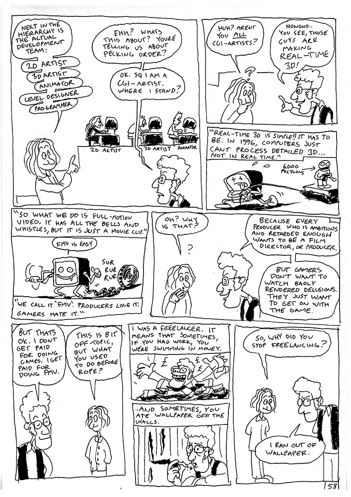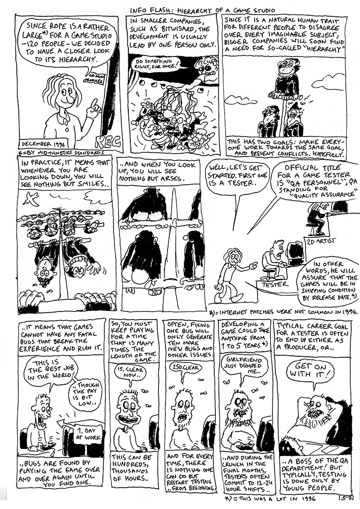 Hierarchy of a large mid-nineties game studio. Various roles explained from the game tester to the director. Also talk about FMV in nineties games and freelancing.